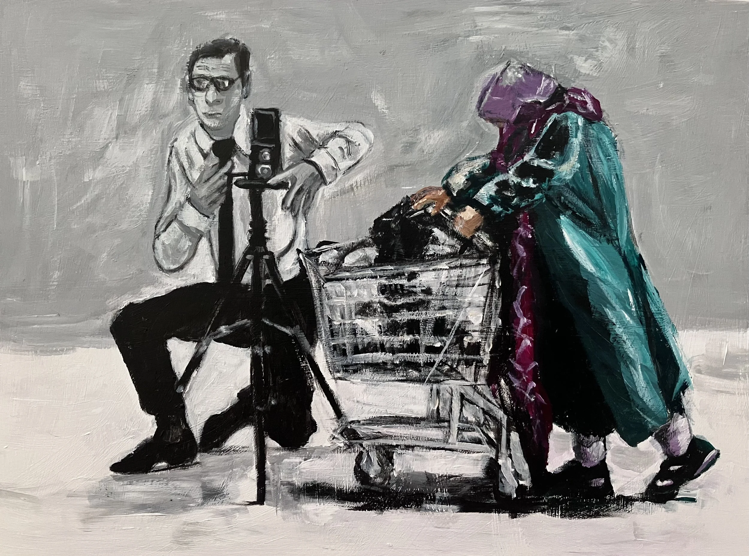 My series of monotone paintings are about people very much alive, pushing their trolleys between skyscrapers, huddling in bus shelters adorned with advertising, sleeping in tunnels, and living among unrestrained wealth.